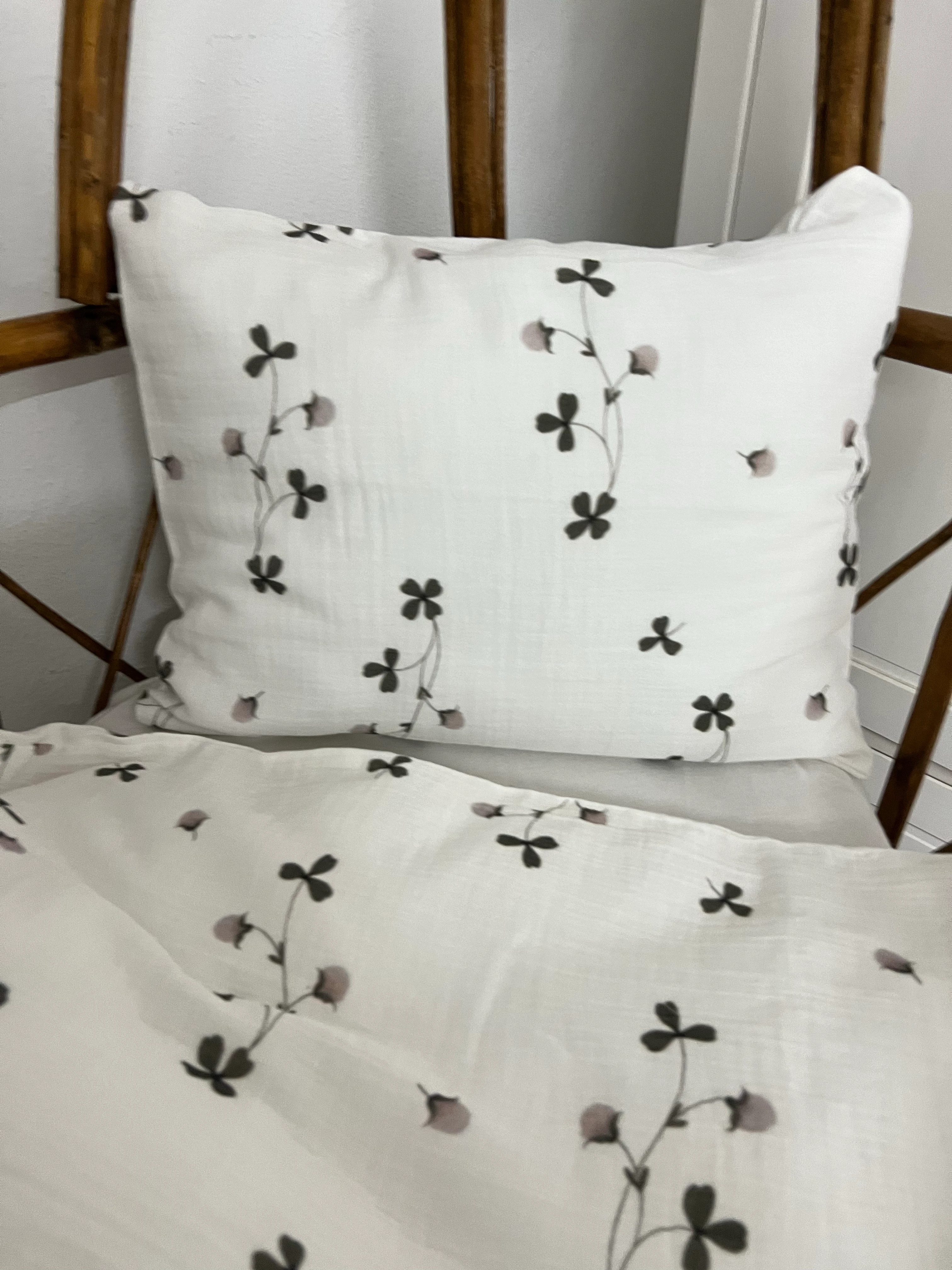 Bu ürün, %100 pamuklu, müslin kumaştan üretilmiş ve üzerine organik sertifikalı boyalarla baskı yapılmıştır.; Paket İçeriği: 80x120 cm çift yüz baskılı nevresim ve 35x45 cm müslin yastık kılıfı ve 70x110cm pazen lastikli çarşaf şeklindedir.; Üretim fazlası üründür.